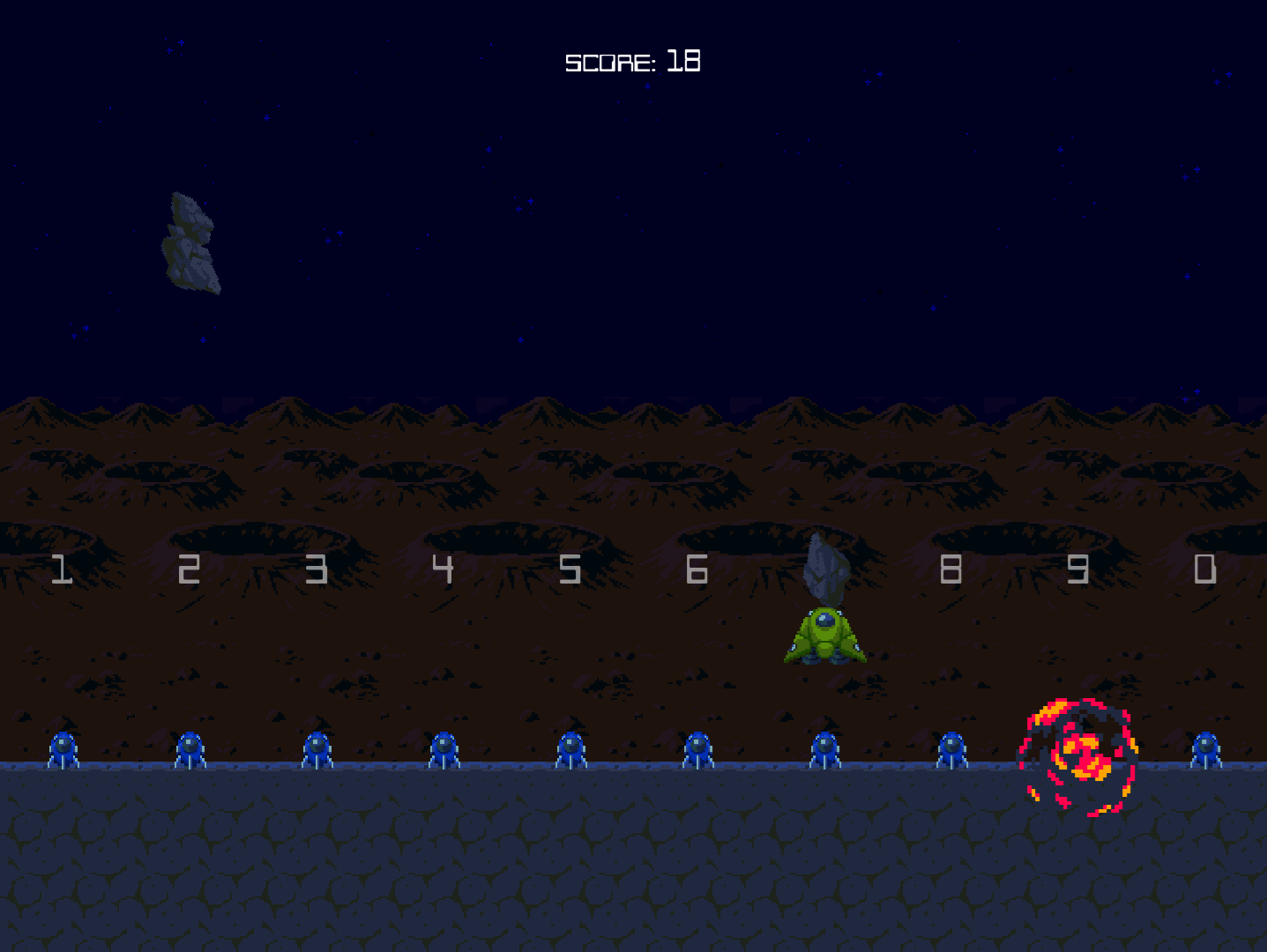 Basic planet defence gameplay using the number keys on the keyboard to defend 10 lanes of asteroids on course for your home planet. How many asteroids can you stop before you are overwhelmed?